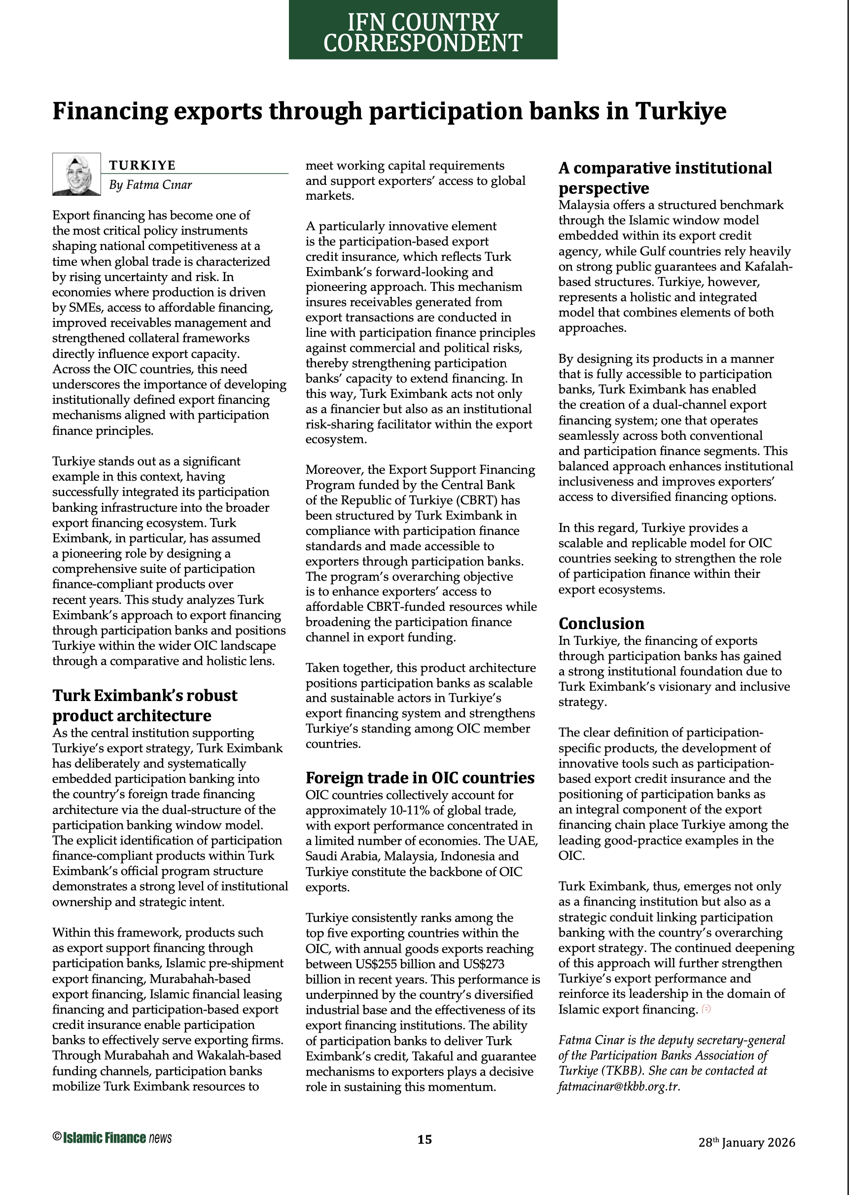 İhracatın finansmanı, küresel ticaretin artan belirsizlikler ve riskler altında yürütüldüğü bir dönemde, ülkelerin rekabet gücünü belirleyen temel politika araçlarından biri hâline gelmiştir. Özellikle KOBİ ağırlıklı üretim yapısına sahip ekonomilerde, uygun maliyetli finansman, alacak risklerinin azaltılması ve teminat mekanizmalarının güçlendirilmesi ihracat performansını doğrudan etkilemektedir. İslam İşbirliği Teşkilatı (OIC) ülkelerinde ise bu ihtiyaç, katılım finans ilkeleriyle uyumlu, kurumsal olarak tanımlanmış ürün ve mekanizmaların geliştirilmesini zorunlu kılmaktadır. Bu bağlamda Türkiye, katılım bankacılığı altyapısını ihracat finansmanı ekosistemiyle buluşturan önemli bir örnek sunmaktadır. Özellikle Türk Eximbank, son yıllarda geliştirdiği katılım finans ilkelerine uygun ürün mimarisiyle bu alanda belirleyici bir rol üstlenmektedir. Bu çalışma, Türk Eximbank’ın katılım bankalarına yönelik ihracat finansmanı yaklaşımını ve Türkiye’nin Organisation of Islamic Cooperation (OIC) ülkeleri içindeki konumunu bütüncül ve karşılaştırmalı bir perspektifle ele almaktadır.